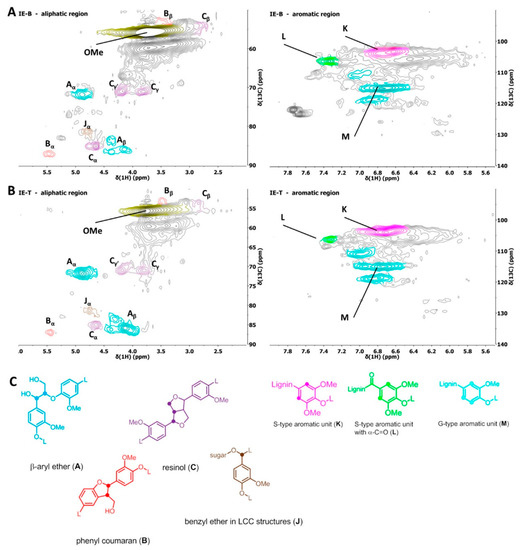 HSQC spectra of (A) IEB and (B) IET. The aliphatic region is shown on the left, while the aromatic region is displayed on the right. (C) Important identified and colour-coded structural units.