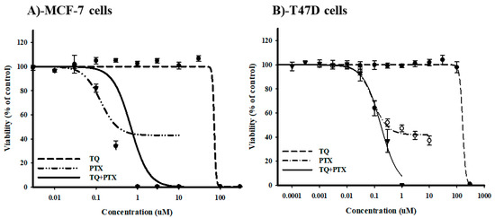 The effect of thymoquinone (TQ) on the dose-response curve of paclitaxel (PTX) in MCF-7 (A) and T47D (B) breast cancer cell lines. Cells were exposed to the serial dilution of PTX, TQ, or their combination for 72 h. Cell viability was determined using a sulfarodamine-B (SRB) assay, and data are expressed as mean ± SD (n = 3).