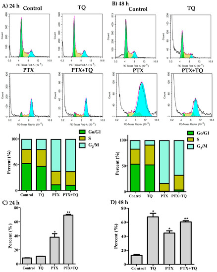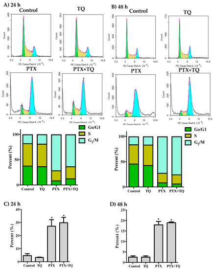 Further assessment for the interaction between TQ and PTX against cell cycle progression was undertaken using DNA content flow cytometry. In MCF-7 cells, PTX significantly arrested the cell cycle at G2/M-phase with a significant increase in the G2/M-phase population from 17.5 ± 2.3% to 71.2 ± 0.8% and from 15.9 ± 2% to 72.1 ± 2.8% after 24 h and 48 h, respectively (Figure 2A,B). TQ alone did not cause any significant change in the cell cycle distribution of MCF-7 cells. However, a combination of TQ with PTX induced a significant increase in the S-phase cell population (from 19.9 ± 0.5% to 23.8 ± 1%) after 24 h (Figure 2A). The cell cycle arrest at G2/M-phase induced by PTX alone and in combination with TQ resulted in cell death; a significant increase of Pre-G phase population was observed from 4.7 ± 1.5% to 27.1 ± 5% and 29.8 ± 4%, respectively, after 24 h (Figure 2C) and from 2.5 ± 0.6% to 17.9 ± 1.6%, 18.9 ± 0.4%, respectively, after 48 h (Figure 2D).