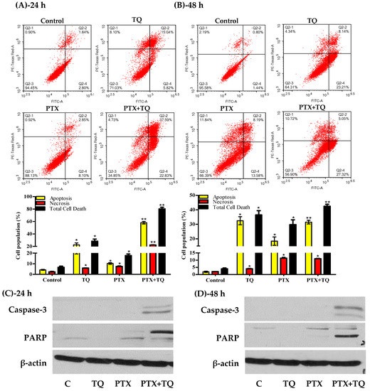 Herein, we investigated the effect of TQ in overcoming MCF-7, T47D cells resistance to PTX by inducing further apoptosis, necrosis, and/or autophagy. T47D cells were exposed to the pre-determined IC50 values of PTX, TQ, and their combination for 24 and 48 h rather than 72 h to detect early apoptotic events. Apoptosis/necrosis populations were then determined by Annexin-V/FITC-PI staining coupled with a flowcytometry technique. Both TQ alone and PTX alone induced a significant apoptosis after 24 h of exposure (22.4 ± 3.2% and 10.3 ± 0.8%, respectively) compared to untreated control T47D cells (4.3 ± 0.5%). Yet, PTX combination with TQ induced significantly more apoptosis compared to PTX treatment alone (58.1 ± 2.1%). In addition to apoptosis, TQ, PTX, and their combination induced significant necrotic cell death in T47D by 5.9 ± 0.3%, 7.4 ± 0.7%, and 22.2 ± 0.6%, respectively (compared to 2.3 ± 0.7% necrosis in control cells) (Figure 4A)). Similarly, further exposure (48 h) of T47D cells to PTX alone or TQ alone resulted in more apoptosis (18.4 ± 2.9% and 32.5 ± 2.8%, respectively) compared to untreated control cells (1.9 ± 0.5%). Combination of PTX and TQ did not significantly increase T47D apoptotic cell population compared to TQ treatment alone (31.5 ± 1.3%). Moreover, TQ, PTX, and their combination induced significant necrotic cell death in T47D by 4.0 ± 0.4%, 11.3 ± 0.6%, and 11.0 ± 0.4%, respectively (compared to 2.6 ± 0.1% necrosis in control cells) (Figure 4B). To confirm apoptosis, Western blot analysis was carried out for caspase-3 and PARP proteins. PTX induced the expression of caspase-3 after 24 and 48 h. Further combination of PTX with TQ resulted in more active caspase-3 and more cleavage for its downstream target protein, PARP (Figure 4C,D).