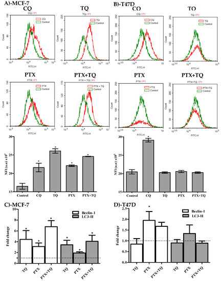 Besides apoptosis, we were keen to study the effect of PTX, TQ, and their combination on other cell death mechanisms such as the autophagy process. In MCF-7, treatment with PTX, TQ, and the combination of PTX+TQ increased the fluorescent intensity indicative of autophagic cell death by 58.2%, 33.9%, and 49.1%, respectively (Figure 5A). On the other hand, none of the treatments under investigation (PTX, TQ, or their combination) induced any significant change or autophagic cell death in T47D (Figure 5B). CQ (positive control autophagic drug) induced autophagic cell response in MCF-7 and T47D cell lines and increased Cyto-ID fluorescence by 31 and 42%, respectively (Figure 5A,B). For further conformation, two key autophagy genes beclin-1 and LC3-II were assessed by the RT-PCR technique. In MCF-7 cells, treatment with PTX, TQ, and the a combination of PTX+TQ significantly increased the expression of beclin-1 by 4.4, 3.1, and 6.8 folds, respectively, and significantly increased the expression of LC3-II by 3.4, 1.9, and 4.1 folds, respectively. In T47D, only PTX marginally increased the expression of beclin-1 by 1.4 folds (Figure 5C,D)