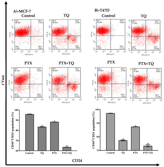 For assessing the effects of TQ, PTX, and their combination against the breast cancer-associated stem cell clone (CD44+/CD24-), cells underwent FITC-labeled anti-CD44 and APC/Cy7-labeled anti-CD24 antibody (Abcam Inc. Cambridge Science Park, Cambridge, UK) staining and flowcytometry assessment. Briefly, cells were treated with the predetermined IC50 values of test drugs (single or combined treatments), or with drug-free media as a control group, for 24 h. After treatment, cells were trypsinized and washed with ice-cold PBS supplemented with 10% FCS. Cells were stained with the conjugated anti-CD44 and anti-CD24 antibodies and kept in the dark at room temperature for 30 min. Cells were then washed three times with ice-cold PBS containing 10% FCS. Cells were then analyzed for FITC and APC/CY7 fluorescent signals using FL1 and FL2 signal detector, respectively (λex/em 488/530 nm for FITC and λex/em 535/617 nm for APC/CY7).