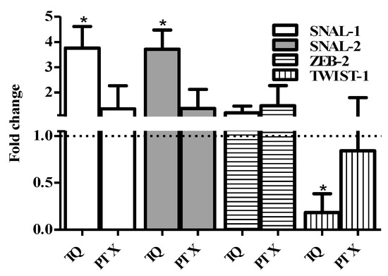Effect of PTX and TQ on the expression of EMT-related genes in MCF-7 cells. Cells were exposed PTX or TQ for 24 h. Total RNA was extracted and subjected to RT-qPCR to measure gene expression. Data were plotted using the 2-ΔΔCt method (expression normalized to the housekeeping gene GAPDH). Fold expression and significance was calculated relative to control untreated cells (dotted line). Data are presented as mean ± SD; n = 3. (*) significantly different from the control group.