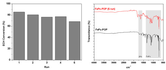 The recyclability of FePc-POP was also studied using epichlorohydrin (ECH) as a substrate at a ratio 1000:1, to handle a greater amount of catalyst and facilitate its recovery. After 2 h, the reaction was stopped, and the liquid was removed. The catalyst was centrifugated with ethanol three times and then it was dried overnight at 90 °C. The liquid was analyzed by gas chromatography observing an ECH conversion of 85.4% (Figure 1 left, run 1). The catalyst was weighed and a new reaction was done using the corresponding amount of fresh ECH and DMAP. After 2 h the ECH conversion was 80.5% (run 2). The procedure was applied three more times (runs 3–5), observing a slight decrease in the ECH conversion. The IR spectrum recorded after the fifth run (Figure 1 right) showed the characteristics FePc bands between 1330 and 730 cm−1 and those attributed to the biphenyl groups. However, the spectrum showed also a broad adsorption at 1795 cm−1 that could be ascribed to some C=O groups from the partial oxidation of methylene linkages during the reaction. The presence of these groups could be causing the decrease in the ECH conversion.
