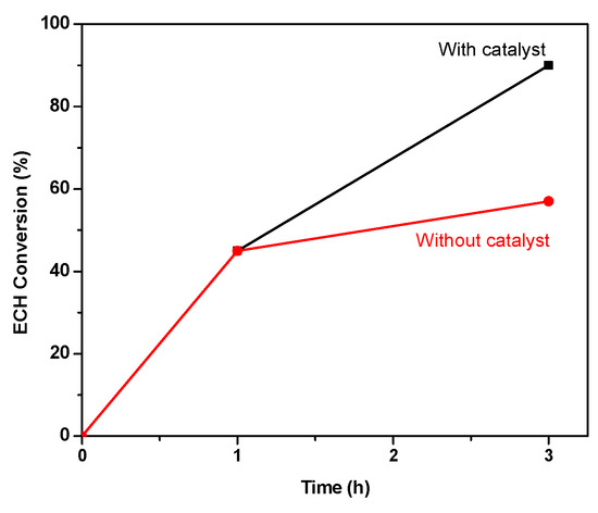 As mentioned in the introduction, the new catalyst was employed in the cycloaddition of CO2 to epoxides, an elegant strategy to convert this gas in useful compounds such as cyclic carbonates. The optimal reaction conditions were established using epichlorohydrin (ECH) as substrate and dimethylamino pyridine DMAP as base. Epiclorohydrin was selected as model substrate because is one of the most interesting epoxides that can be produced from glycerin obtained from vegetable oil [32] and DMAP as base due its proved efficiency compared with other bases [12,33,34,35]. The excellent catalytic activity in presence of this base was firstly reported by Paddok et al. [36] who attributed it to the coordination of DMAP to the metal generating more electron-rich centers in the metal-catalyst.