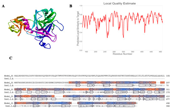 (A) Homology model of TMPRSS2, (B) predicted local quality estimation with chart of target by SWISS-Model server, and (C) sequence alignment between model target(TMPRSS2) and Human Hepsin TMPRSS1 (Human Hepsin TMPRSS1 (5ce1.1.A).1.A.