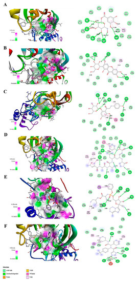 Predicted 3D structure of the ligand-protein interaction at the left side and 2D animated pose showing interaction. (A) Main proteases protein of SARS-CoV-2 with glucogallin. (B) Main proteases protein of SARS-CoV-2 with mangiferin. (C) Main proteases protein of SARS-CoV-2 with phlorizin. (D) Main proteases protein of SARS-CoV-2 with N3. (E) Main proteases protein of SARS-CoV-2 with remdesivir. (F) Main proteases protein of SARS-CoV-2 with X77.