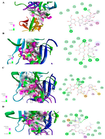 Predicted 3D structure of the ligand–protein interaction at the left side and 2D animated pose showing interaction. (A) TMPRSS2 protein of SARS-CoV-2 with mangiferin. (B) TMPRSS2 protein of SARS-CoV-2 with glucogallin. (C) TMPRSS2 protein of SARS-CoV-2 with phlorizin. (D) TMPRSS2 protein of SARS-CoV-2 with camostat mesylate.