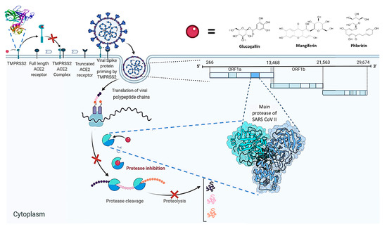 From our data, we can conclude that the natural polyphenolic compounds, i.e., glucogallin, mangiferin, and phlorizin, may have the potential to be used as safe protease inhibitors, which may act by inhibiting TMPRSS2 and SARS-CoV-2 main protease, thus preventing SARS-CoV-2 spike protein priming and viral protein post-translational modification (Figure 7). Other advantages of these compounds are that they possess good absorption, good solubility in water, no inhibitory effect on liver enzymes, no effect on the metabolism of essential drugs such as anticancer, anticonvulsant, and anti-coagulant drugs. The potentiality of these compounds can be further verified and may be confirmed by in vitro study.