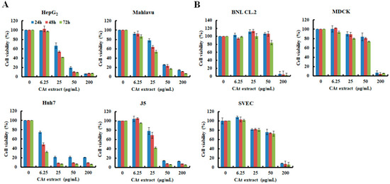 HCC cells (5 × 103 cells/well), BNL CL.2 (4 × 104 cells/well), MDCK, and SVEC (1 × 104 cells/well) were seeded and grown in 96-well plates overnight. Cells were treated with vehicle (0.1% DMSO) and serial concentrations of the CAt extract (0–200 μg/mL) for 24, 48, and 72 h. Cell viability was measured by MTT-based colorimetric assays. The formazan crystals formed were solubilized by DMSO, and the absorbance was measured at a wavelength of 550 nm by a SpectraMax M5 microplate reader (Molecular Devices, San Jose, CA, USA). The effective absorbance was calculated for cell viability (%), which was presented as treatment (OD)/vehicle (OD) × 100%. The experiments were analyzed in triplicate.