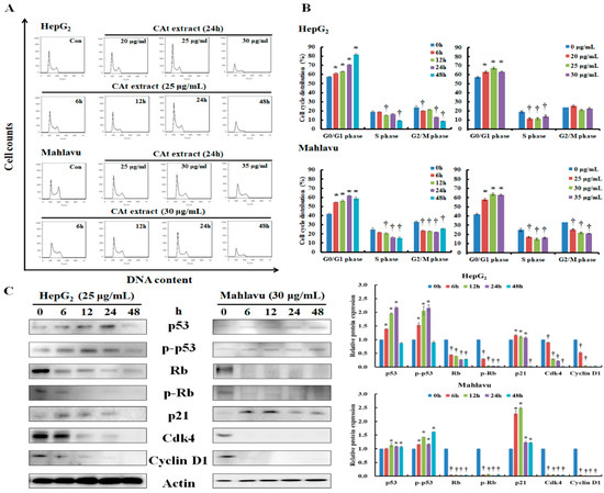Effects of CAt extract treatment on the cell cycle distribution and cell cycle regulators expression in HepG2 and Mahlavu cells. Cells were treated with the indicated CAt extract concentrations for 6, 12, 24, and 48 h. After harvesting, the cells were stained with propidium iodide (PI) and analyzed by flow cytometry. Representative diagram of cell cycle progression (A). Representative histograms of cell cycle distribution (B). The protein expression levels of the cell cycle regulators were assessed by Western blot (C). The actin level was used as loading control. *, †: Significant difference between control and treatment, p < 0.05.