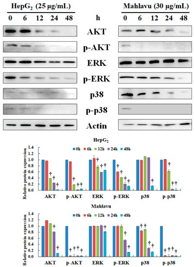 Effect of CAt extract treatment on AKT, ERK, and p38 protein expression in HepG2 and Mahlavu cells. HepG2 and Mahlavu cells were incubated with CAt extract (25 or 30 μg/mL) for the indicated time points (0, 6, 12, 24, and 48 h) then subjected to Western blotting analysis. The actin level was used as loading control. †: Significant difference between control and treatment, p < 0.05.