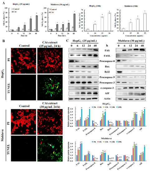 Effects of CAt extract treatment on apoptosis in HepG2 and Mahlavu cells. The percentage of sub-G1 phase which was analyzed by flow cytometry after CAt extract treatment with HepG2 and Mahlavu cells (A). Photograph of TUNEL expression on HepG2 and Mahlavu cells treated with or without CAt extract (25 or 30 μg/mL) for 24 h by fluorescence microscope (B), red arrow: anoikis; blue arrow: chromatin condensation; yellow arrow: DNA fragments; white arrow: apoptotic bodies. Cells treated with CAt extract (25 or 30 μg/mL) for 0, 6, 12, 24, and 48 h, and cell lysates were collected for analysis of indicated protein expression. Effects of CAt-extract-induced apoptotic protein expression was analyzed by Western blot (C). c-caspase-3: cleaved caspase-3. *, †: Significant difference between control and treatment, p < 0.05.