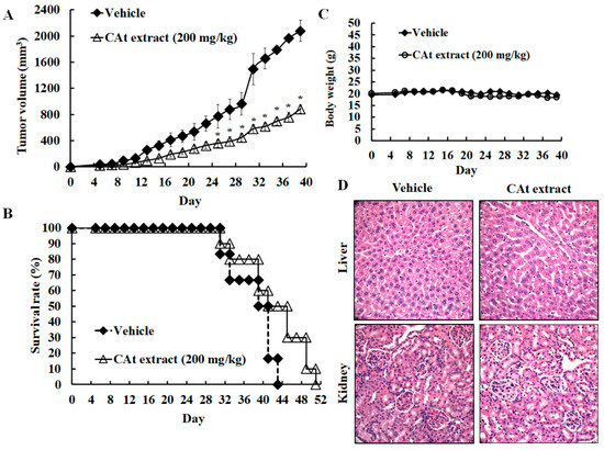The xenograft tumor model of HCC treated with the CAt extract (200 mg/kg). The tumor suppression (A) and the survival rate (B) of HCC tumor growth after CAt extract treatment. Evaluation of systemic toxicity of CAt extract administration on the HCC xenograft. The body weight after CAt extract treatment (C). The hematoxylin/eosin (H&E) staining of the liver and kidney (D).
