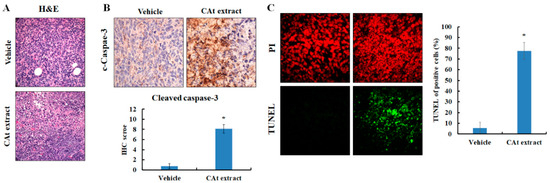 CAt-extract-induced apoptosis in the HCC xenograft tumor model by H&E, immunohistochemical (IHC), and TUNEL staining. (A) Tissue morphology, evaluated with H&E staining. (B) CAt-extract-induced cleaved caspase-3 expression. (C) TUNEL staining for the observation of apoptotic cells. *: A significant difference between control and treatment, p < 0.05.