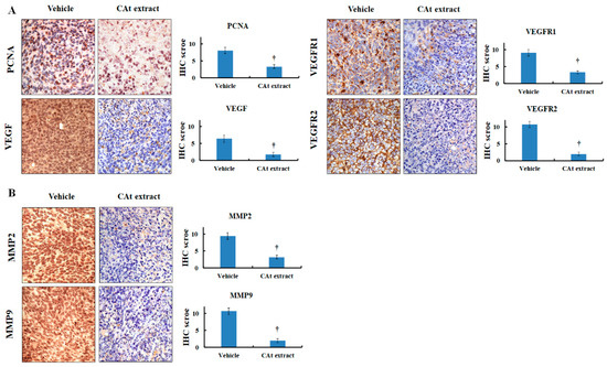 CAt-extract-induced inhibitory effect in the HCC xenograft tumor model by IHC staining. Indicated protein expression in HCC tumor tissues was stained by IHC. (A) The level of PCNA, VEGF, VEGFR1, and VEGFR2 protein. (B) The level of MMP2 and MMP9 protein. †: A significant difference between control and treatment, p < 0.05.