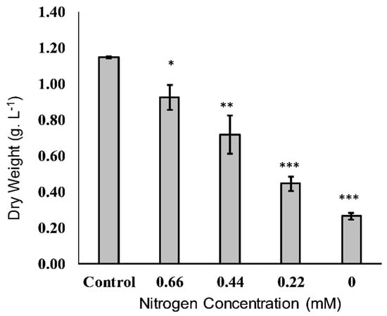 Dry microalgal biomass typically contains about 50% carbon and 10% nitrogen, and their typical responses to nitrogen deficiency are drastic declines in dry weight (DW) and growth []. Under certain stressful conditions, such as nitrogen deficiency, cells tend to survive by accumulating large amounts of carotenoids and lipids []. High levels of irradiation, salinity, organic carbon, and free radicals can also induce these responses. Relative to the standard conditions (0.88 mM NaNO3), nitrogen depletion in the current study resulted in a linear decline in dry cell weight (Figure 1).