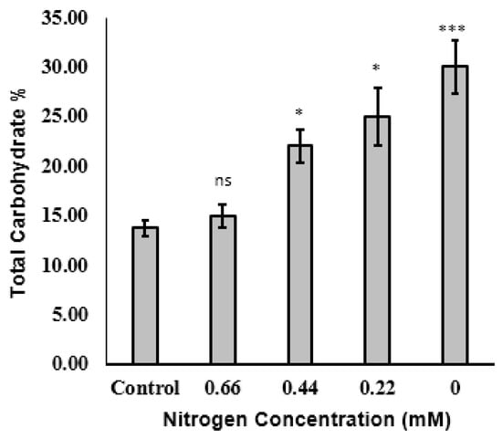 Nitrogen deficiency in the microalgal growth medium leads to an increased carbohydrate content due to reduced protein synthesis; however, a lack of carbohydrate accumulation under this condition may also be due to hyper-accumulation of lipids []. In the present study, nitrogen depletion was linearly related to carbohydrate content (Figure 3). In particular, the carbohydrate content increased from 13.71% DW in the control medium to 28% DW in the nitrogen-free medium. DNA, chlorophyll, and proteins all contain nitrogen, and nitrogen limitation decreases microalgal growth and increases carbohydrate productivity []. In addition, reactive oxygen species (ROS) react with lipids, proteins, and DNA, leading to oxidative stress [,]. The most notable effect of nitrogen depletion is increased lipid accumulation, followed by increased chlorophyll decomposition and carbohydrate accumulation []. Although nitrogen deficiency leads to protein and chlorophyll decomposition, the carbohydrate content increased, which might be attributed to the increased storage of metabolites in the presence of sodium acetate as exo-organic carbon. Alternatively, nitrogen deficiency might lead to sugar condensation, which in turn increases the level of non- reduced sugars. Rehman and Anala found that nitrogen depletion increased the biosynthesis of lipids and starch in Chlorococcum sp. []. Other studies on microalgal growth under nitrogen starvation confirmed dramatic effects on photosynthesis, and this in turn led to changes in the lipids, carbohydrates, proteins, pigments, and fatty acid contents [].