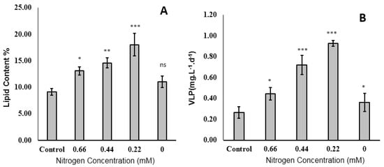 Lipid content (A) and volumetric lipid productivity (VLP) (B) of Tisochrysis lutea grown mixotrophically in different concentrations of NaNO3. * p < 0.05, ** p < 0.01, *** p < 0.001, ns: not significant with respect to the control (0.88 mM).