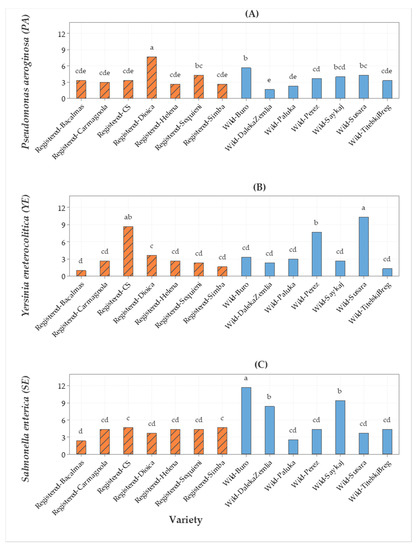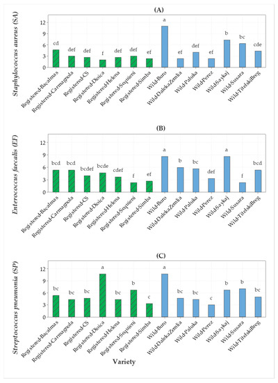 The differences among the mean antimicrobial activities (SA, EF, SP, PA, YE, SE, CA, CK, and CT) obtained from the seven registered cultivars (Bacalmas, Carmagnola, CS, Dioica, Helena, Sequieni, and Simba) and seven wild accessions (Buro, Daleka zemlia, Paluka, Perez, Saykaj, Susara, and Titelski breg) were also compared using one-way ANOVA with three replications.