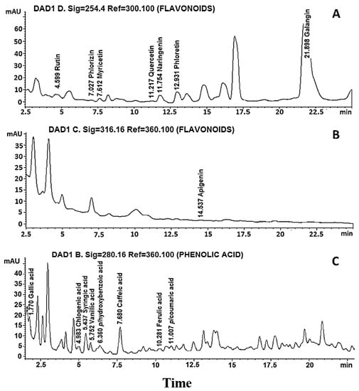 For the flavonoids, the analyses were performed on a Hypersil ODS (125 × 40 mm) Hewlett Packard Column with a gradient of (A) H2O at pH 2.5 with trifluoroacetic acid (TFA) and (B) acetonitrile (ACN) and the following parameters: flow, 1 mL/min; temperature, 30 °C, injection volume: 20 µL; λ1: 254 nm, λ2: 316 nm, and analysis time 25 min. The standards used were rutin, phloridzin, myricetin, quercetin, naringenin, phloretin, apigenin and galangin.