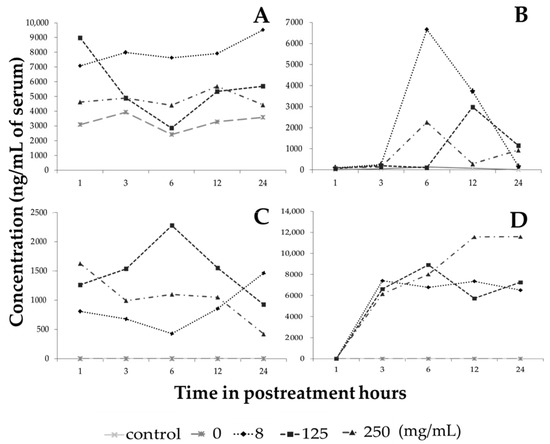 Concentration of secondary metabolites present in serum from mice treated with the extract of the Sechium H387 07 hybrid. (A) Galangin, (B) phloretin, (C) naringenin, and (D) chlorogenic acid.