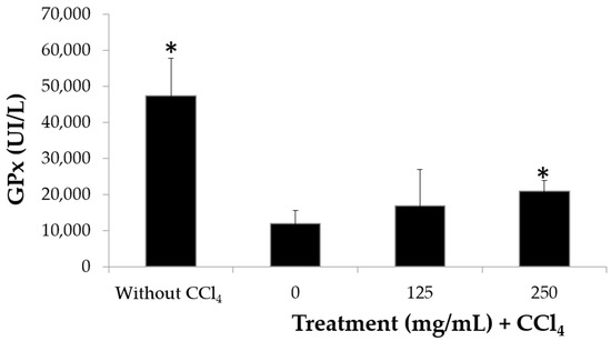 Concentration of glutathione peroxidase glutathione peroxidase (GPx) in blood lysates of mice treated or not treated with the H387 07 extract for a month with or without induction of oxidation by carbon tetrachloride (CCl4). n = 10 mice per treatment ± standard deviation. * Significant difference (Tukey p < 0.05).