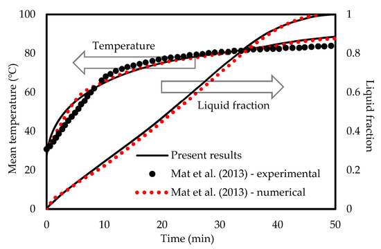 The FLUENT code was verified using the investigation of Mat et al. [67] for both temperature and liquid-fraction which was performed numerically and experimentally. Mat et al. [67] studied a fined double-tube latent heat storage unit using RT58 as the PCM with constant wall temperature as the boundary condition. As shown in Figure 4, an excellent agreement is achieved in comparison with the data of Mat et al. [67] in this study. In the temperature profile, the maximum deviation between the present numerical study and experimental data is almost 9% while it is around 5% compared with the numerical study of Mat et al. [67]. For the liquid-fraction, the maximum deviation is 4% between the present numerical results and the numerical study of Mat et al. [67].