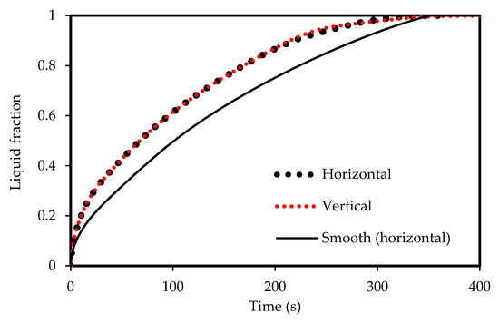 Liquid-fraction evolution during melting in the horizontal and vertical corrugated channel compared with smooth horizontal channel.
