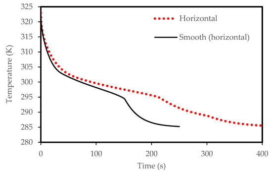 The PCM solidification rate for the case of the corrugated plate remains quicker than that for the smooth flat plate over the entire solidification process, as shown in Figure 7. This is due to the larger surface area of the corrugated surface configuration. For the same size of the PCM in both cases, the total solidification time is 280 s in the case of the corrugated plate compared to 303 s in the case of the smooth plate. Therefore, the time saving due to the use of the corrugate channel is about 7% during the solidification mode. Figure 8 presents the average temperature of the PCM inside the channel for both cases. The temperature in the corrugated system drops faster than the smooth surface. This behavior is due to the effective role of the natural convection heat transfer, which is greater in the case of the corrugated configuration because of the larger surface area of heat transfer.