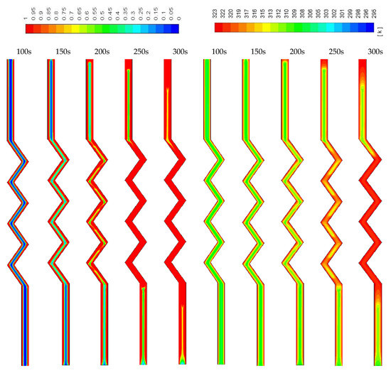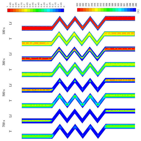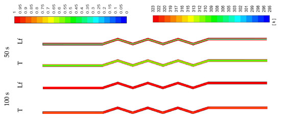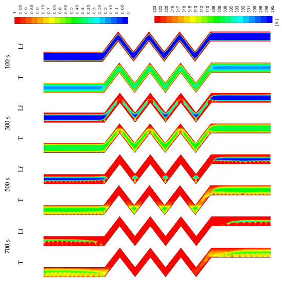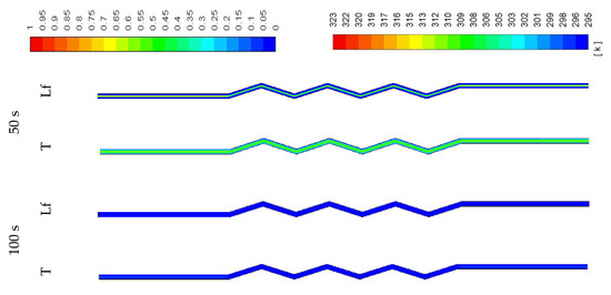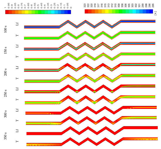 In Figure 11, development of the temperature and the liquid-fraction for the vertical corrugated channel is illustrated. The PCM is melted totally within 400 s. The end of the left-hand side of the channel (bottom part of the channel) remains solid due to the regional effect of gravity. This is clear also from the temperature contours, which show the top side is relatively warmer than the bottom side.