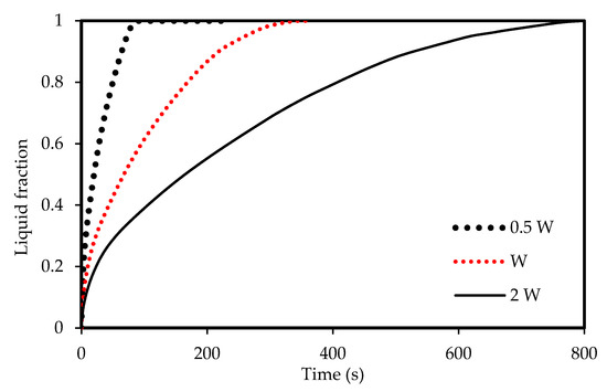Evolution of the liquid-fraction for the melting process in the horizontal corrugated channel for different widths.