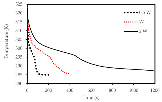 The width of the channel also has an influence on the solidification rate due to natural convection. Figure 14 shows that the PCM in the thinner channel solidifies faster (82 s) than the thicker channels. This behavior is also illustrated in Figure 15, which shows that the PCM in the 0.5 W width channel reaches the equilibrium temperature.