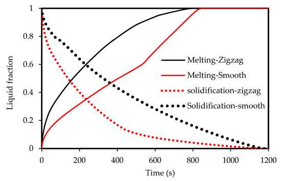 Evolution of the liquid-fraction in both melting and solidification processes for both Zigzag and smooth channels for the case 2 W width channel.