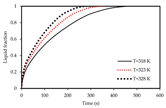Evolution of the liquid-fraction of the melting process in the horizontal corrugated channel for different airflow temperatures.