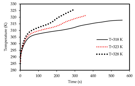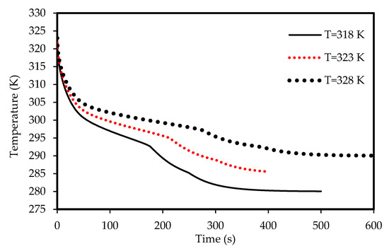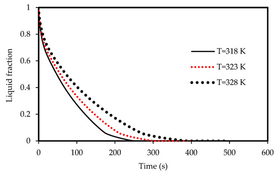 Lower airflow temperature leads to faster rate of solidification since the mean temperature of the PCM is low with lower airflow temperature. Thus, the critical phase change temperature is reached faster as shown in Figure 23. All the PCM solidifies over 240 s and 360 s in the cases of 318 K and 328 K airflow temperatures, respectively. This behavior is clear also from Figure 24. The average PCM temperature drops to 285 K and 297 K within 240s for the airflow temperatures of 318 K and 328 K, respectively, and in the case of 320 K, the PCM temperature reaches 294 K.