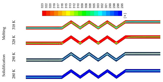 Figure 16 shows the melting and solidification process in both zigzag and smooth configurations for the case of the 2 W width channel. The processes in the zigzag configuration have a faster rate because the increase in the size and the surface area of the storage unit. The melting process in the zigzag channel takes less than 760 s, while it takes 840 s for the smooth configuration. The solidification for both processes finished takes 1200 s, but with the zigzag configuration, the solidification is faster, taking 450 s, and then it became slower.