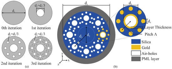In Figure 1a we schematized the design of the fractal cross-section of the optical fiber. A solid circle of diameter is used as the starting point, i.e., as the 0-th iteration step. The solid circle is then divided into 9 identical circles with fractional diameter . More specifically, these sub-circles are distributed as a central circle surrounded by eight identical circles. The central circle is removed in the first iteration step and, as depicted in Figure 1a, the same procedure is recursively applied to the remaining eight solid sub-circles and so on until the third iteration step. We used this geometry to build our fractal PCF but without removing the center circle (fiber core), where light is guided along the fiber, indicated by a dashed circle in Figure 1b. Plasmonic effects are introduced in the system considering that one of these fractal subsets has metallic components. In particular, we considered a fractal subset consisting of a gold-coated hole surrounded by gold nanowires, as represented in the inset of Figure 1b.