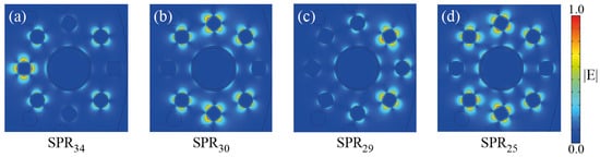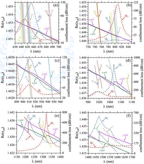 The circular symmetry of each metallic nanowire and nanoshell allows for a large set of plasmonic resonaces of different orders []. Moreover, the interaction between nearby metallic scatterers increases the number of allowed resonances through plasmonic hybridization [,], i.e., the overlap of plasmonic near-fields between adjacent metallic scatterers, which resembles the electronic bands from well-localized atomic orbitals in solid state physics [,]. The fractional sizes of different nearby scatterers, i.e., the fractal-like geometry, also introduce a broadening of the frequency range for SPR excitation [,]. In Figure 2, we plot the and -values (confinement loss) for ranging from 630 nm to 1700 nm. For visualization purposes, this wavelength range was divided in six different regions presented in Figure 2a–f. Results of for the SPR and core-guided modes are shown for x-pol and y-pol. From the phase-matching condition we identified a total of 34 SPR modes in the structure, as it can be seen from Figure 2, which were labeled with numbers from 34 to 1. For small values we can note subsets of close SPR modes, due to similar symmetries of the SPR modes [], which must overlap producing broader peaks. In Figure 3, we show the near-field profiles of SPR, SPR, SPR, and SPR, from where we clearly note that the SPR modes preserve the mirror-symmetry of the structure around the x-axis, i.e., for rotations of 180, as expected. We also note two pair of degenerate SPR modes, in particular the modes 21 and 22, and 10 and 11, which are due to equivalent high-order symmetries of the circular geometry [,]. We should remark the polarization selective excitation of SPR modes. The weakly confined modes labeled as 23 and 24 in Figure 2 are only excited for the x-polarization, where a small peak for is observed around the phase-matching condition. Moreover, in the frequency range from 720 nm to 850 nm, plasmon resonances are exclusively excited for x-polarization. This polarization selectivity becomes more evident for higher values, as noticed from Figure 2e,f.