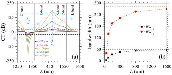 where L is the fiber length. Since x and y polarizations can be easily separated for [], we used dB as the reference values, indicated by horizontal dashed lines in Figure 4a. As the CT values strongly depend on L, see Equation (3), we carried out calculations for L = 25 m, 50 m, 100 m, 200 m and 400 m. We should emphasize here that negative CT-values correspond to high y-pol signal over x-pol, whereas positive CT denote high x-pol signal over y-pol. From Figure 4a, we can see that polarization filtering only works for , i.e., when . Two resonant wavelengths at nm and nm, corresponding to SPRs, are indicated by vertical dashed arrows in this figure. In terms of telecommunication windows, x-pol is filtered at the O-band (1260 nm to 1360 nm), whereas the y-pol is filtered at the E/S/C/L-bands (1360 nm to 1625 nm). The filtering bandwidths, associated to resonant wavelengths and , are presented as BW and BW, respectively, in Figure 4b for PCF lengths up to m. From this latter figure we clearly note a monotonically increasing of BW and BW, which asymptotically approaches BW nm and BW nm.