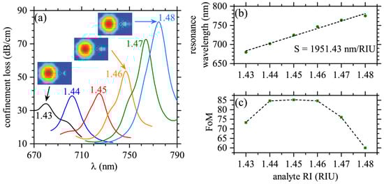 (a) Confinement loss for x-polarized light () is presented as function of the wavelength for different refractive indexes of the analyte medium. The electric field profiles are shown in the insets for some peaks, as indicated by arrows. The corresponding refractive index of the analyte is shown in the corresponding peak. (b) Wavelength of the peak in as function of the refractive index of the analyte medium. Dashed line corresponds to the linear fitting of the results, with a slope (sensitivity) of 1951.43 nm/refractive index unit (RIU). (c) A FoM defined as the ratio between the sensitivity-peak and the corresponding full width at half maximum (FWHM), .