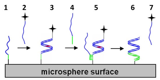Schematic illustrating series of events for (1) microsphere-immobilized single-stranded probe incubated with (2) a labeled primary target to form (3) a labeled primary duplex with a center mismatch shown in red. Upon incubation with (4) a longer secondary or competitive target, this competitive target (5) nucleates a secondary duplex by binding to the initially unhybridized toehold segment of the immobilized probe (shown in green) and ultimately proceeds to form (6) an unlabeled, perfectly-matched secondary duplex by (7) displacing the original, shorter primary target. (Reprinted with permission from Hardin and Milam [61] Copyright 2013 American Chemical Society).