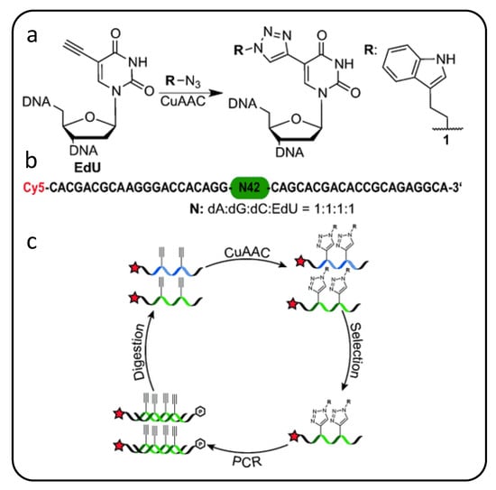 Schematic illustration of modified sequence libraries incorporating synthetic handles to side-step PCR amplification issues during click-SELEX. (a) To chemically modify nucleotides, C5-ethynyl handle-modified uracil nucleobases in the precursor sequences are converted to chemical groups (shown as R in 1) using click chemistry to prepare (b) random sequence library. (c) During click-SELEX a modified library is incubated with a target (not shown). Following selection and recovery of target-binding sequences, the modified library must be “reverse transcribed” back to the precursor sequences bearing only the C5-ethynyl handle to facilitate PCR amplification-based enrichment of aptamer candidates. Finally, the now enriched candidate sequence population is subjected to a click reaction once more to reintroduce the chemical modification and begin the next selection cycle. (Reprinted with permission from Tolle et al. [89] Copyright 2015 WILEY-VCH Verlag GmbH & Co. KGaA, Weinheim).