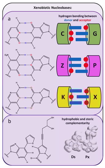 Examples of artificial nucleobase chemistries with non-Watson–Crick base-pairing complementarity. (Box (a)) Compared to the placement of hydrogen bond donors and acceptors notated in a natural C:G base-pair, one hydrogen bond donor and acceptor are repositioned in xenobiotic Z:P and K:X nucleobase pairs. (Reprinted with permission from Sefah et al. [96]) (Box (b)) Spatial alignment of hydrophobic groups in Ds and Px bases induce complementary pairing. (Reprinted with permission from Nature Publishing Group, Nature Biotechnology, Kimoto et al. [98] Copyright 2013).