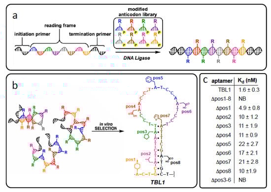 (Box (a)) Synthesis of densely modified oligonucleotides by ligase-catalyzed oligonucleotide polymerization (LOOPER) from pentanucleotide segments each bearing one chemical modification. (Box (b)) Example of a winning sequence (TBL1) isolated after in vitro selection steps with color coded anticodons and their respective modifications illustrated. (Box (c)) Quantitative analysis of the TBL1 LOOPER aptamer binding affinity to indicate how removing individual modifications in Box (b) affects the equilibrium dissociation constant, Kd, to demonstrate the role of chemical modifications to TBL1 binding function. (Reprinted with permission from Kong et al. [94,103] Copyright 2020 and 2017 American Chemical Society).