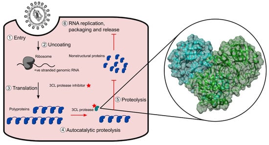 Schematic representation of the SARS-CoV-2 lifecycle in a host cell and the interruption by a 3CLpro inhibitor. The insert is the crystal structure of 3CLpro derived from PDB: 6M2Q.