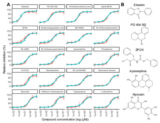 Dose–response curves for the top 20 inhibitors identified in this study and selected structures for compounds discussed in the text. (A) Dose–response assays were performed both with (blue) and without (red) 0.01% Triton X-100. Each compound was assessed across a 5-fold serial dilution series starting at 20 µM. Relative inhibition was calculated using the average R528/477 for the protease treated controls as 0% inhibition and the average R528/477 for the no protease controls as 100% inhibition. Experiments were performed in triplicate using a different preparation of purified eCFP-Venus biosensor for each repeat. EC50 values were calculated using the R package ‘dra’ [16], and all data points are shown. (B) Structures of five compounds that are discussed further in the text. Compounds tested in this Panel A are: Ebselen; PD 404,182; 4-Chloromercuribenzoic acid; 2-(alpha-Naphthoyl)ethyltrimethylammonium (alpha-NETA); Z-l-Phe chloromethyl ketone (ZPCK); Nordihydroguaiaretic acid; ZM 39923; R(−)-N-Allylnorapomorphine; R(−)-Propylnorapomorphine (R(−)-NPA); R(−)-2-Hydroxyapomorphine; Apomorphine; Piceatannol; U-73122; Dihydrexidine; R(−)-2,10,11-Trihydroxy-N-propylnoraporphine (R(−)-2-OH-NPA); Bromoenol lactone; Myricetin; 6-Nitroso-1,2-benzopyrone; Capsazepine; (−)-Eseroline.