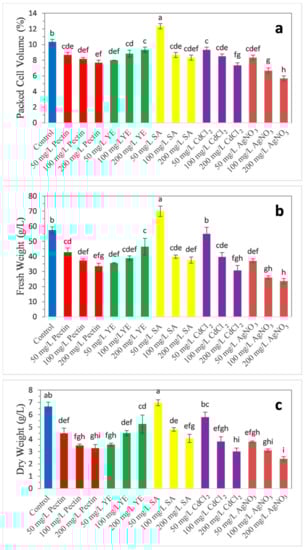 Effect of elicitors on biomass accumulation in date palm cell suspension culture: (a) packed cell volume (%), (b) fresh weight (g/L), (c) dry weight (g/L). Values are represented in means of triplicate with the standard error. Mean values following the same letters in columns are not significantly different, according to Duncan’s multiple range (p ≤ 0.05) test.