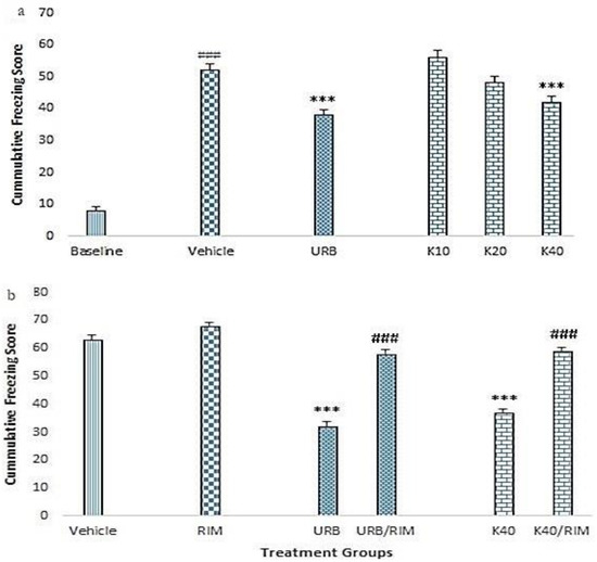 Our data showed (Figure 2a) that the rats subject to fear conditioning exhibited significantly higher freezing scores as compare to baseline groups (F (1,58) = 87, p < 0.001). The standard drug URB treatment caused a significant decline in the freezing score as compared to vehicle control (F (1,98) = 26, p < 0.001). Furthermore, the kaempferol-treated rats showed decreasing trend of freezing score, which became significant at the highest tested dose of 40 mg/kg [F (4,245) = 13, p < 0.001].