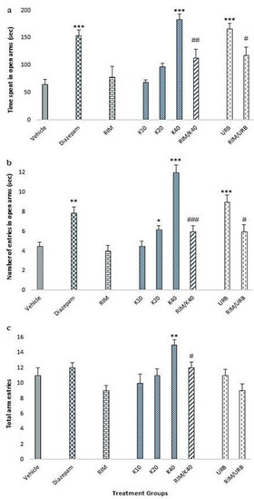 Among various treatments and its combinations, only kaempferol at the dose of 40 mg/kg caused a significant elevation in the total arm entries of elevated plus maze as compared to vehicle control [F (8,63) = 3.9, p < 0.01] (Figure 3c). Additionally, the co-administration of RIM caused a reversal of the effect produced by kaempferol 40 mg/kg and URB on the total arm entries but statistical significance was achieved with kaempferol 40 alone (F (1,14) = 8, p < 0.05).